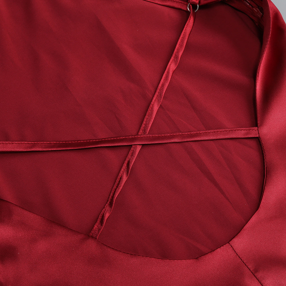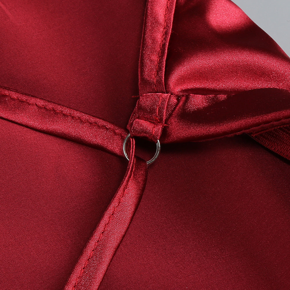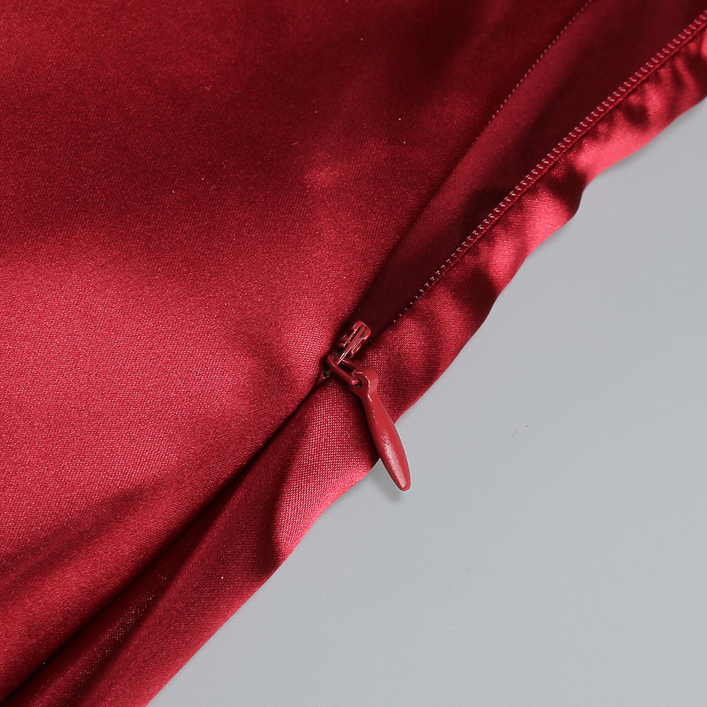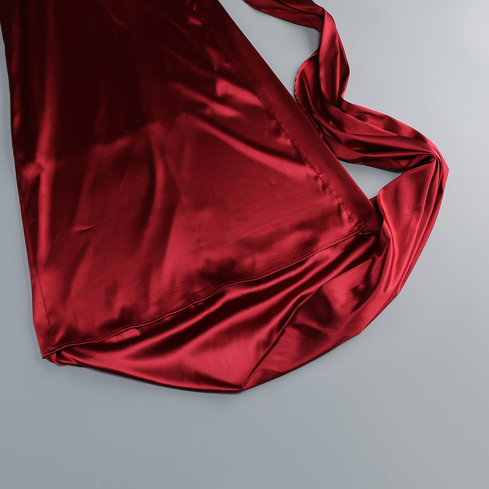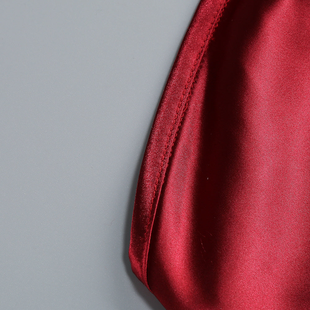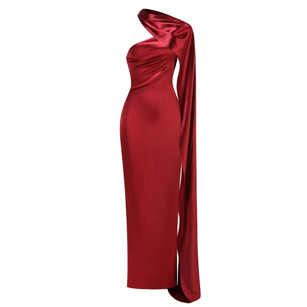 A long, fluid drape falls like a ceremonial ribbon, guiding the eye in slow elegance. The form beneath remains pure and sculpted. Made for evenings that feel both powerful and intimate.