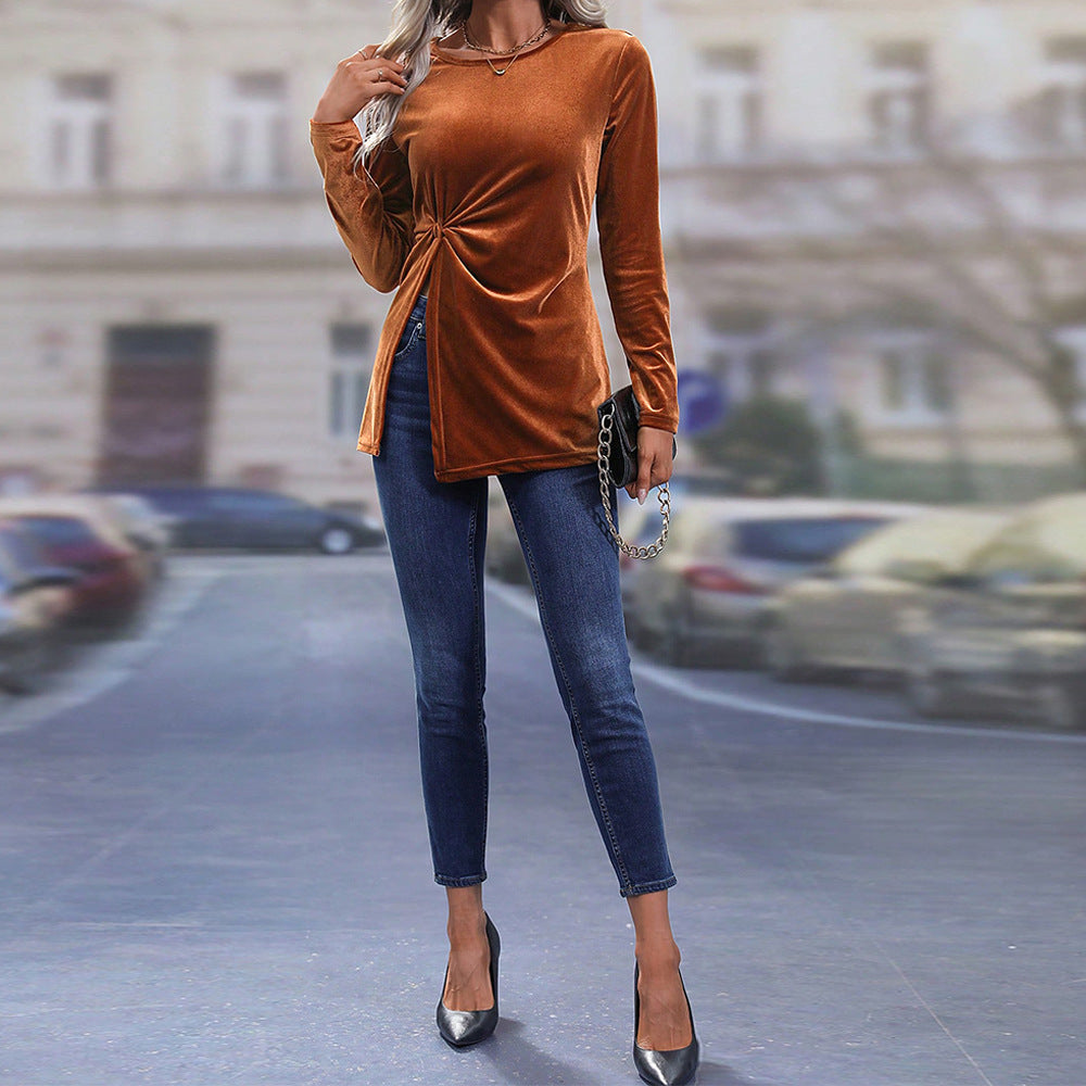 Warm velvet kissed by amber light, shaped with a delicate side twist that flatters effortlessly. It’s the kind of piece that makes even coffee runs feel like a runway. Rich, soft, and undeniably chic.
