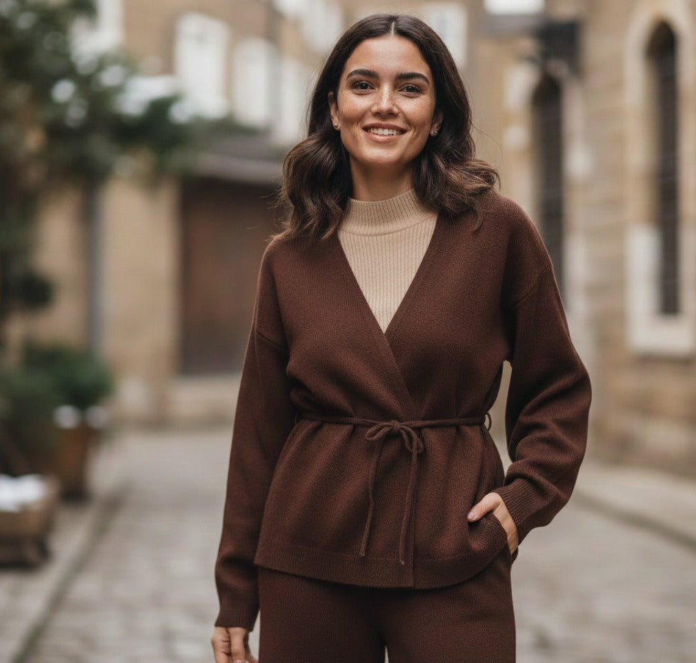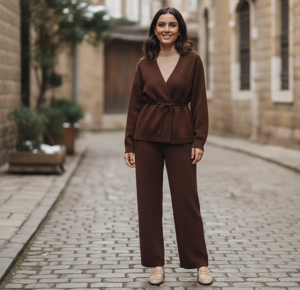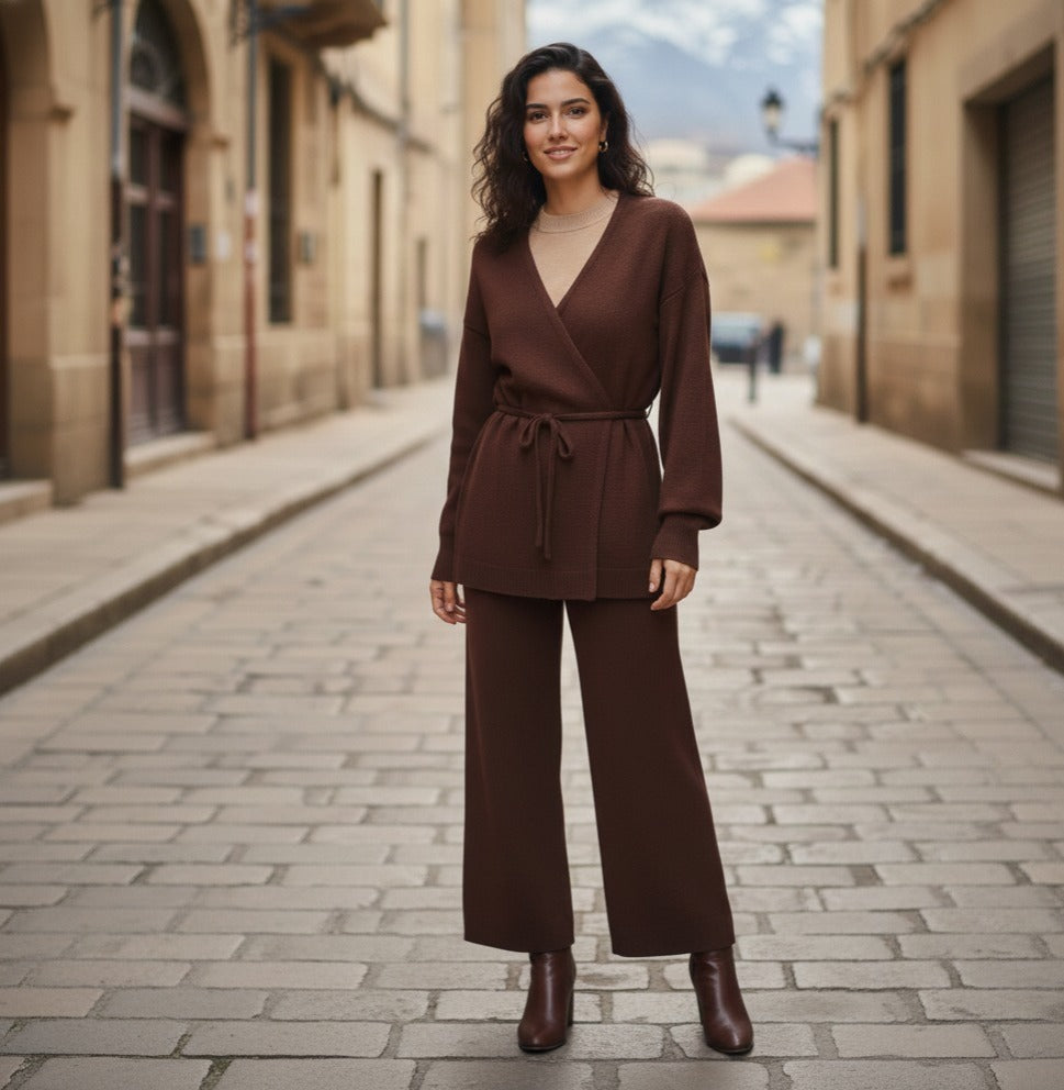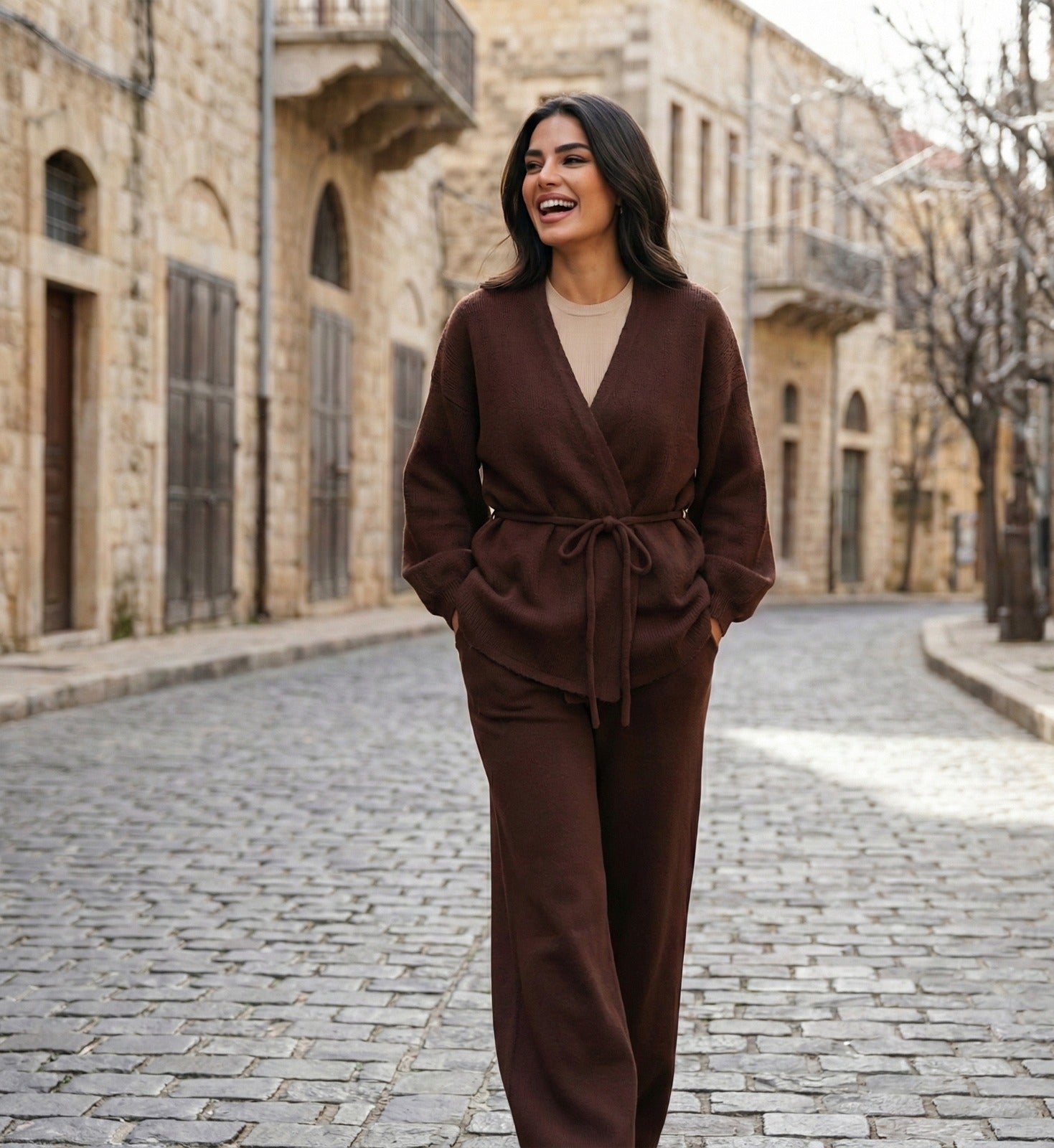 Sleek, effortless, and endlessly versatile, the Midnight Poise set redefines modern elegance. Its soft knit fabric drapes gently with a self-tie waist that flatters every silhouette. Perfect for cozy evenings or refined city strolls, where comfort meets quiet allure.
