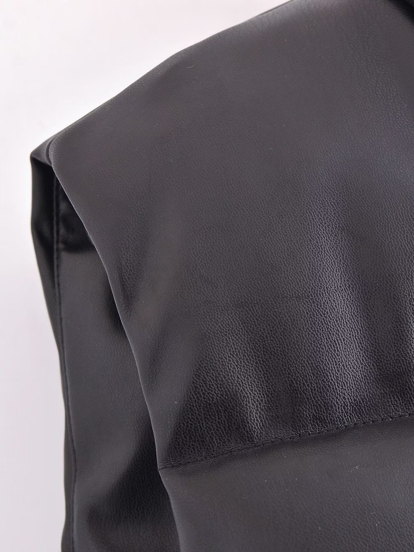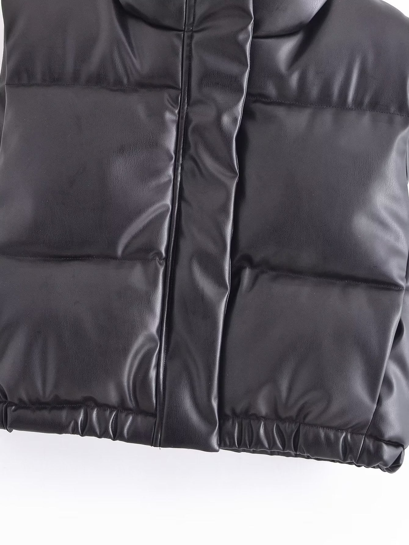 Effortlessly cool, the Midnight Puff vest captures urban chic in a sleek silhouette. Its glossy texture and cropped design make it the perfect balance of edge and elegance, a statement of power in simplicity.