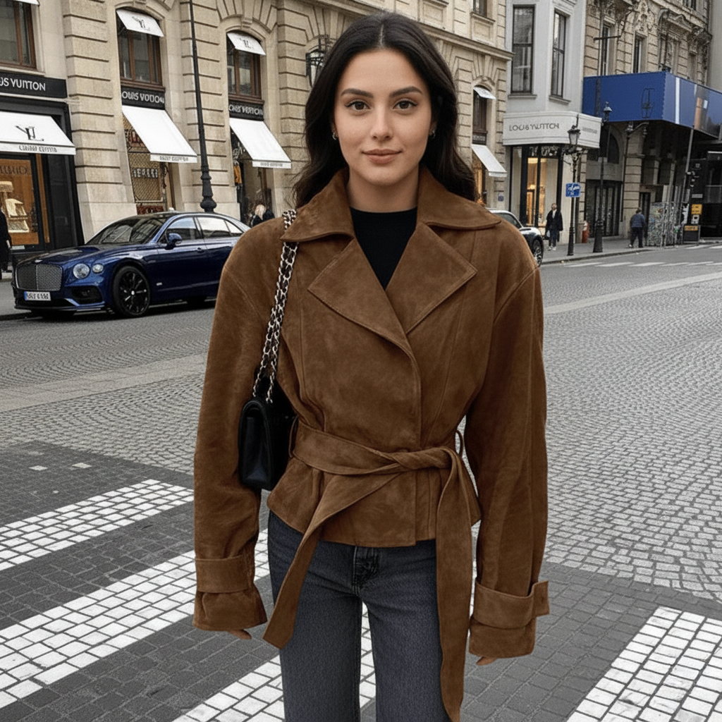 Indulge in the velvet-soft touch of this genuine suede wrap jacket. The rich, warm brown perfectly complements its tailored, cropped cut, defining the waist with a sensual, oversized tie. It's a piece of understated luxury that provides structure and impeccable class, proving true sophistication is felt, not simply seen.
