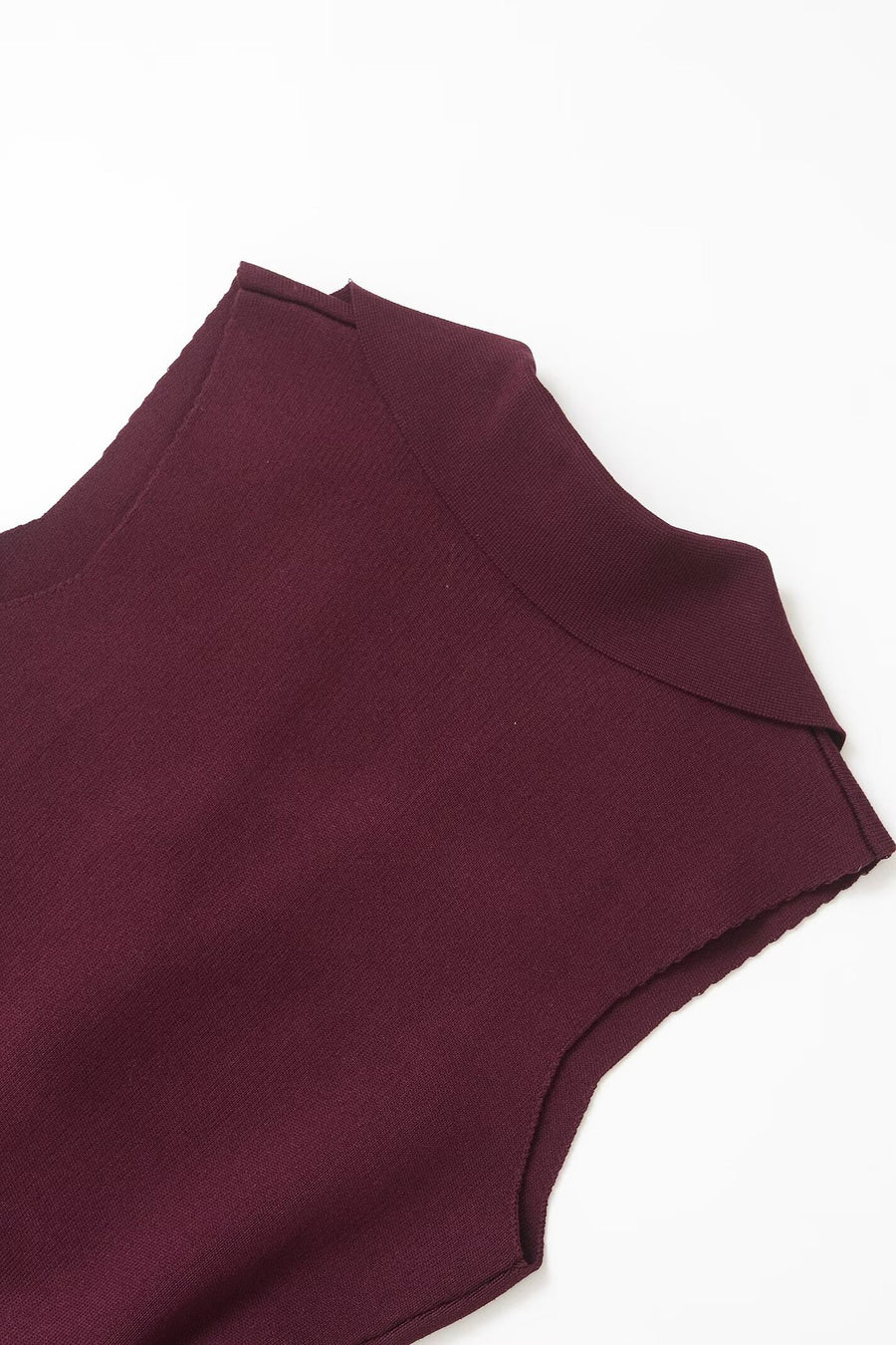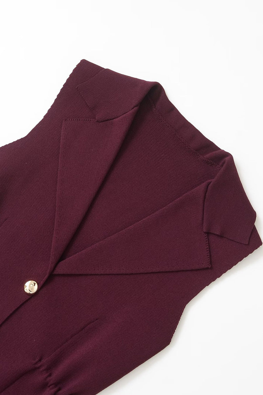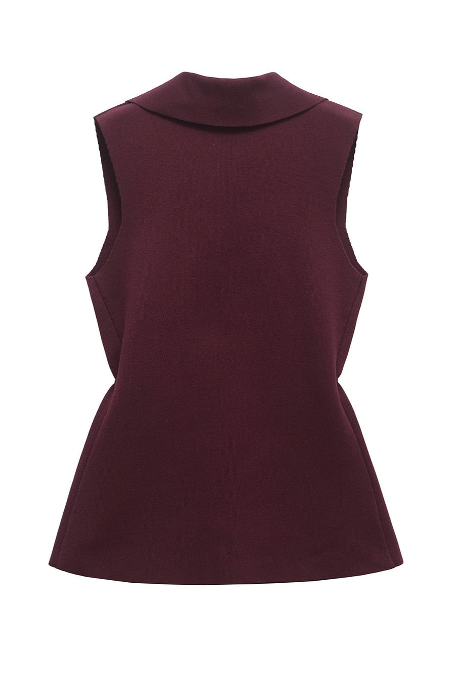 A sleeveless structured vest in rich burgundy with sculpted waist detailing and gold accents. Sharp lines meet softness at the curves. It carries that quiet CEO energy.