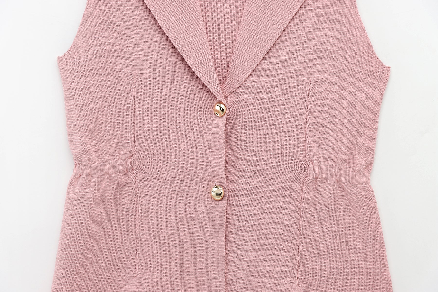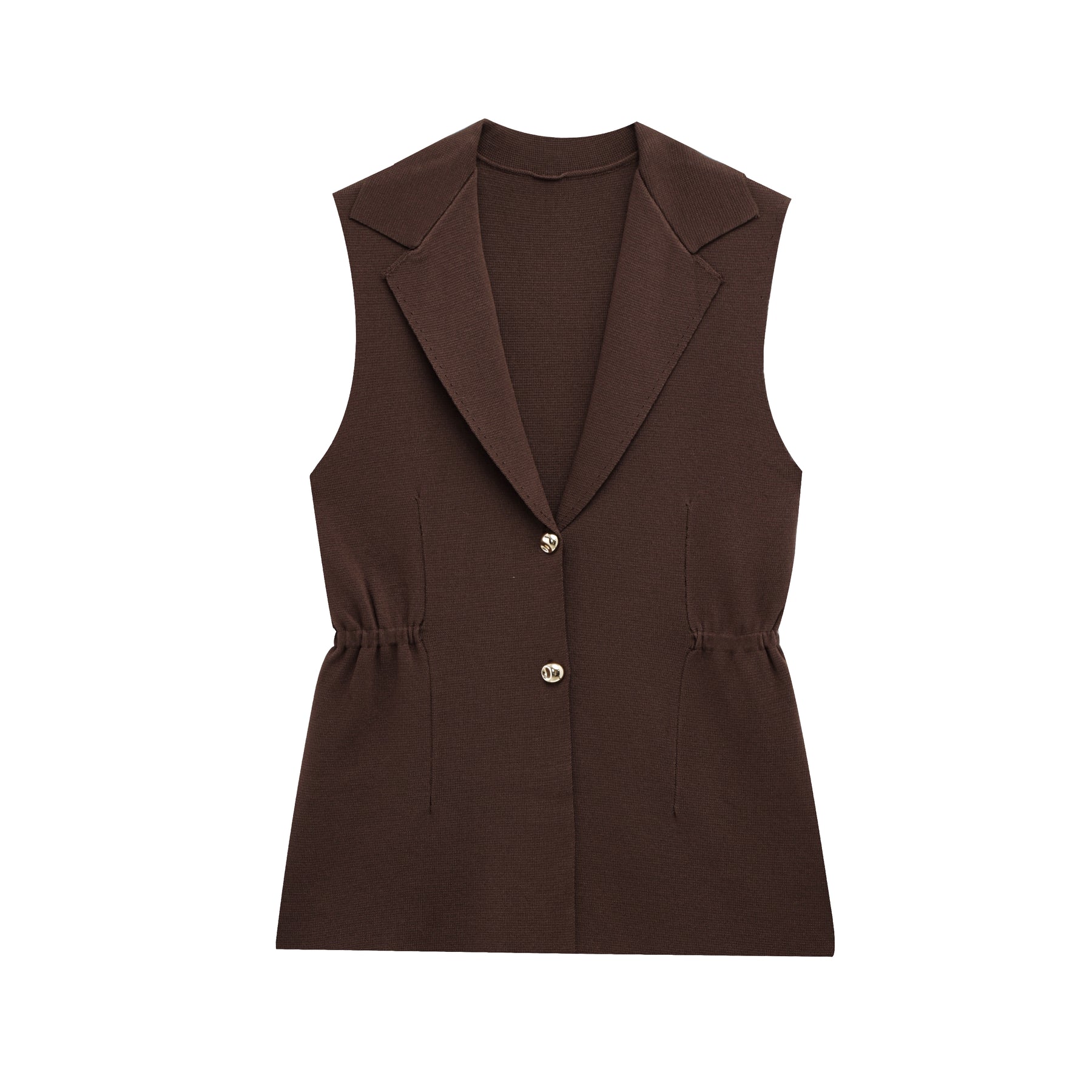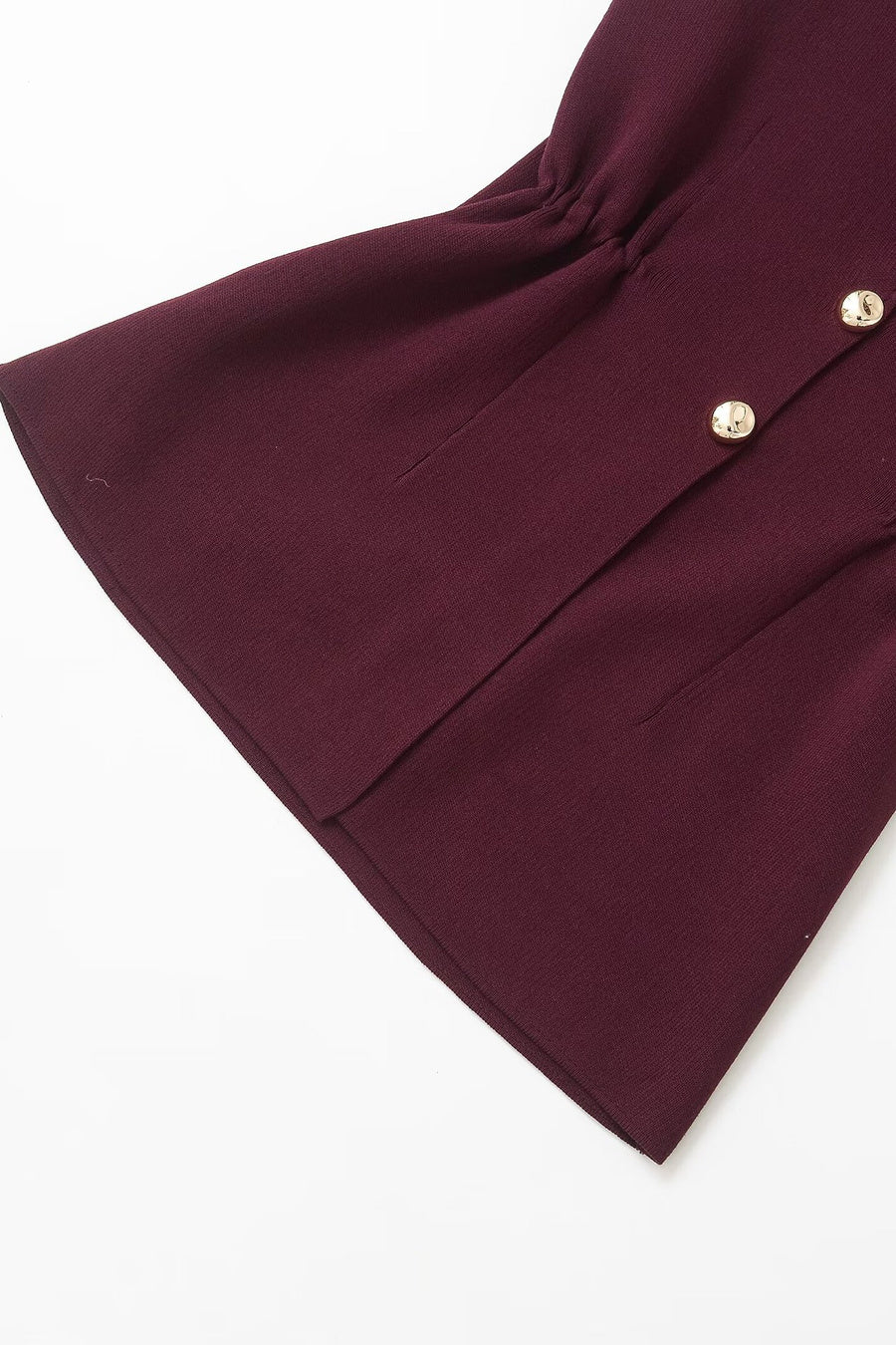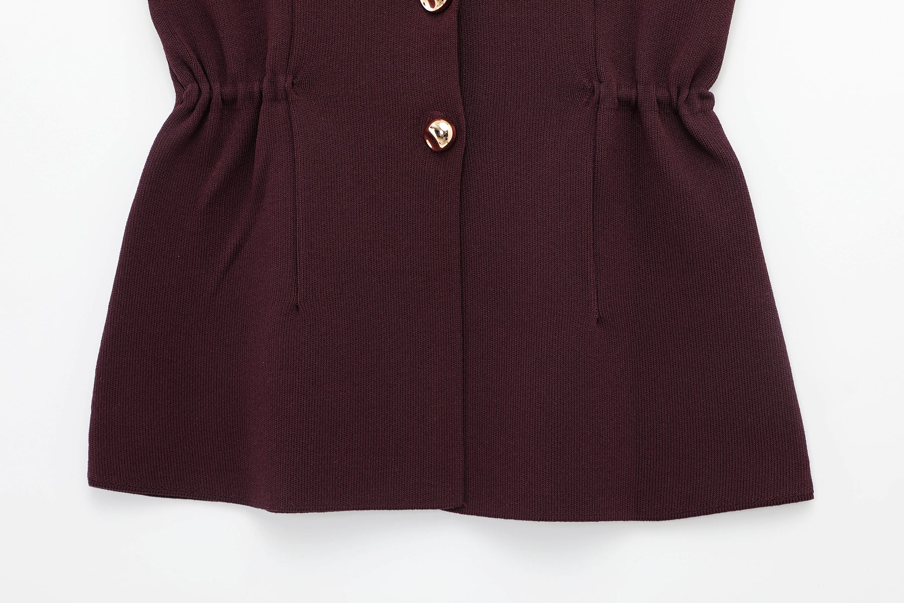 A sleeveless structured vest in rich burgundy with sculpted waist detailing and gold accents. Sharp lines meet softness at the curves. It carries that quiet CEO energy.