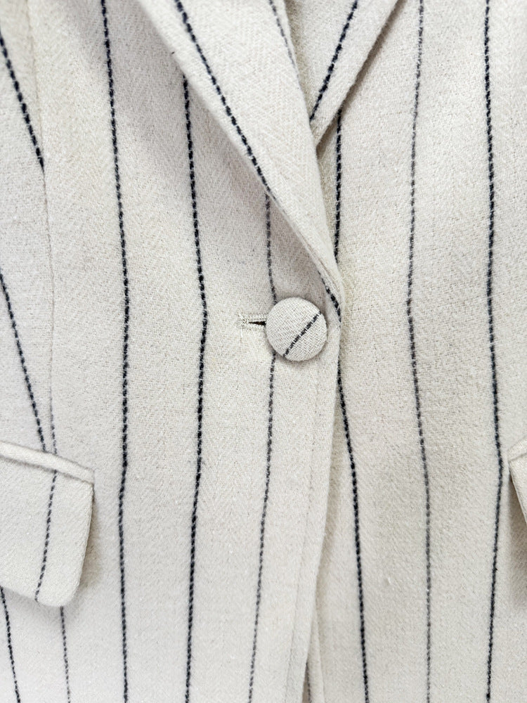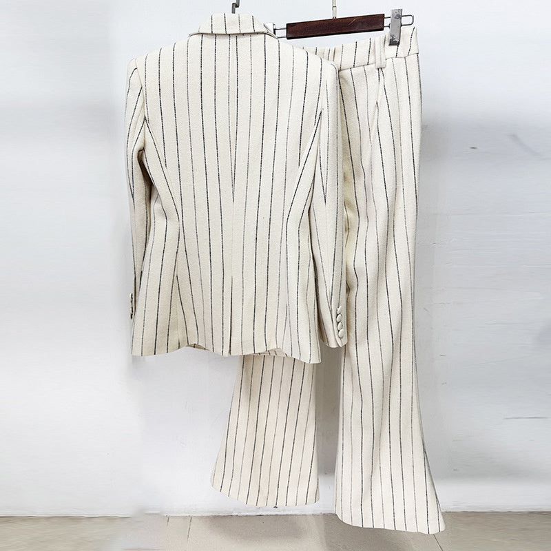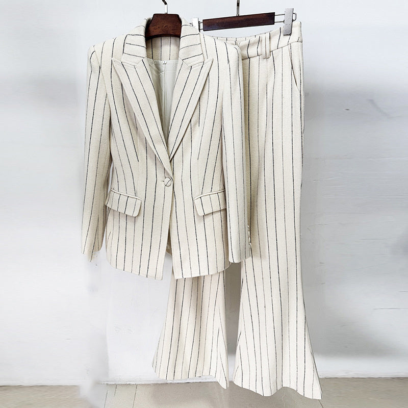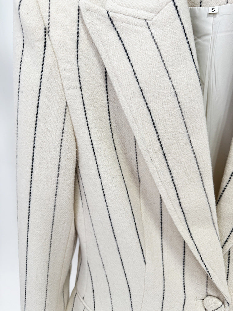 A cream pinstripe suit cut close at the waist and lengthened through the leg. Understated yet magnetic, it carries that effortless European confidence. The kind of tailoring that speaks before you do.