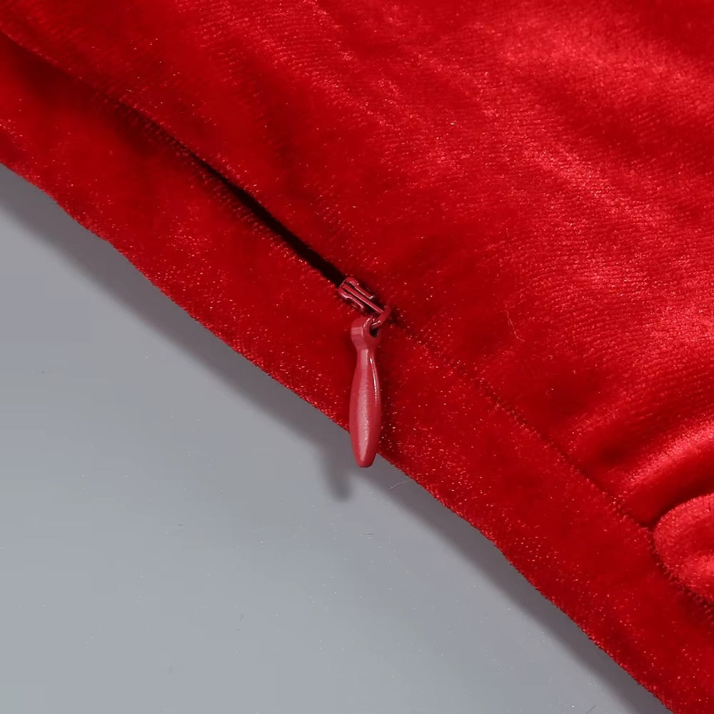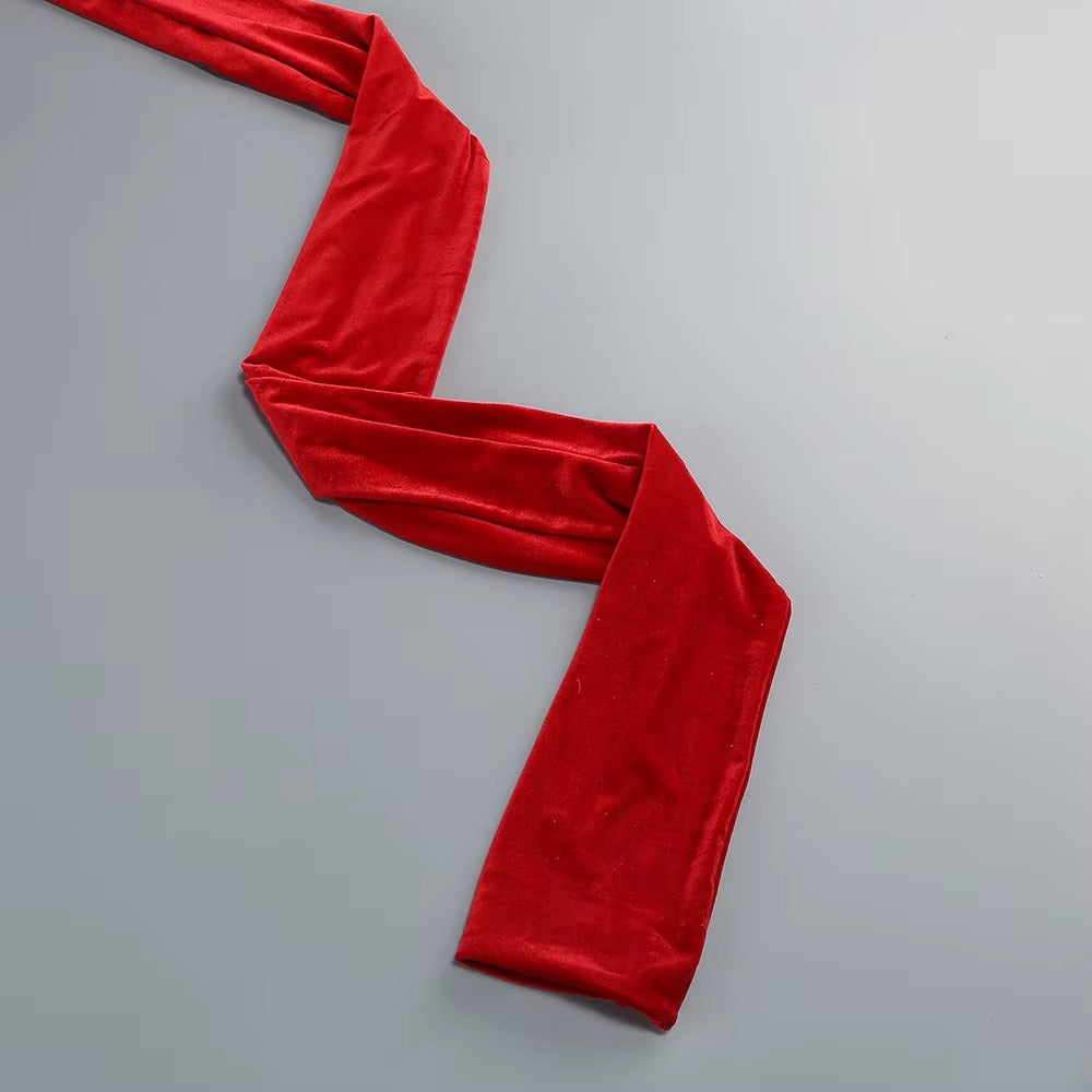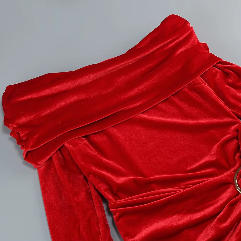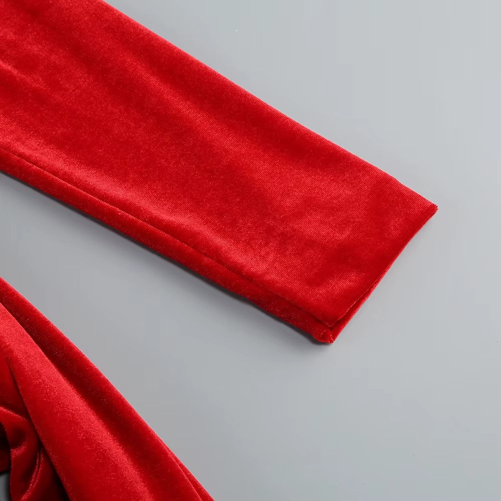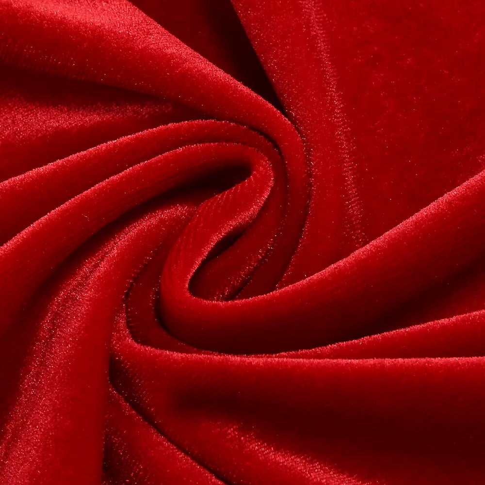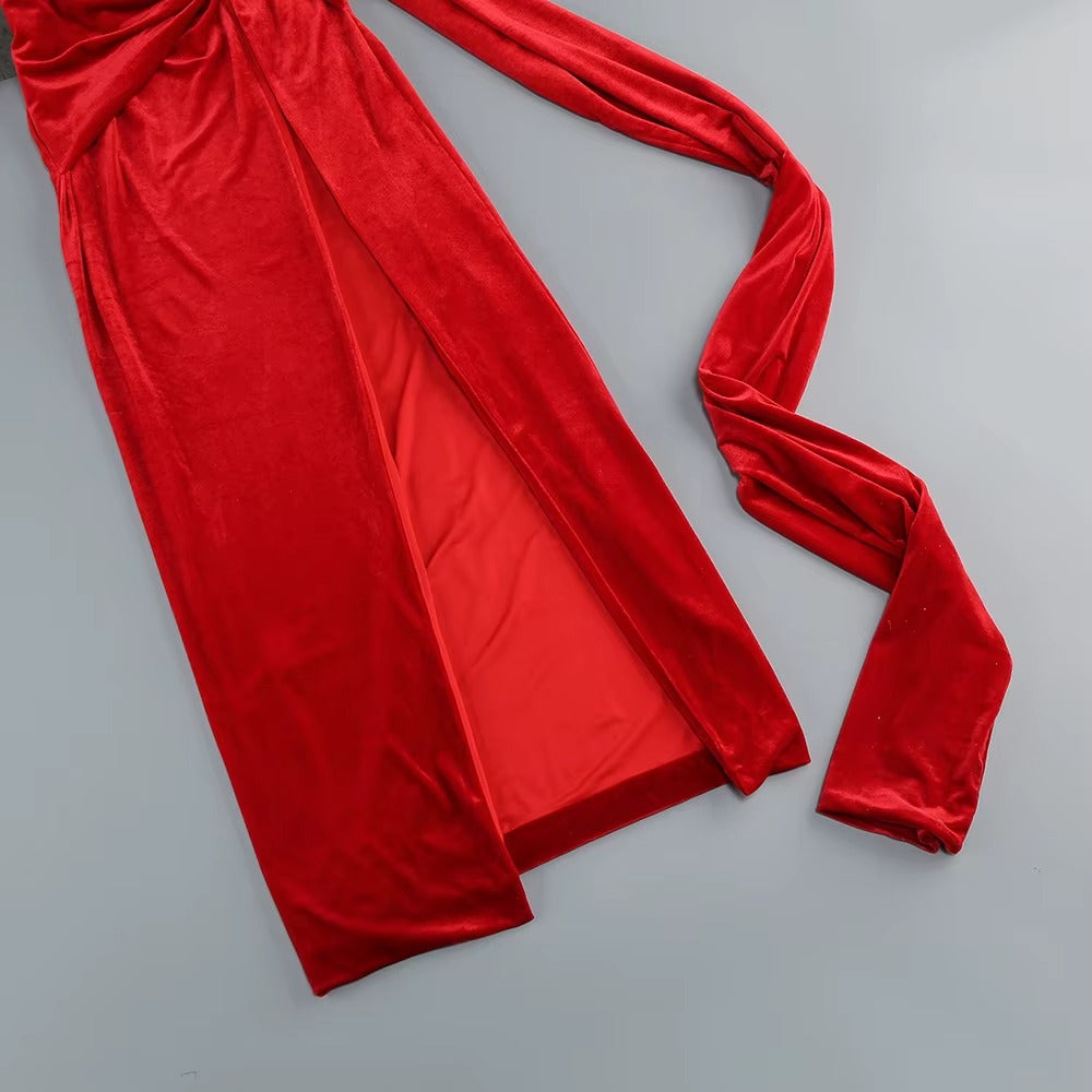 Draping falls effortlessly from the neckline, gathered gently at the waist as if held in place by intention alone. The long trailing panel moves behind you like a whispered promise. This is red in its most controlled form: powerful, elegant, unforgettable.