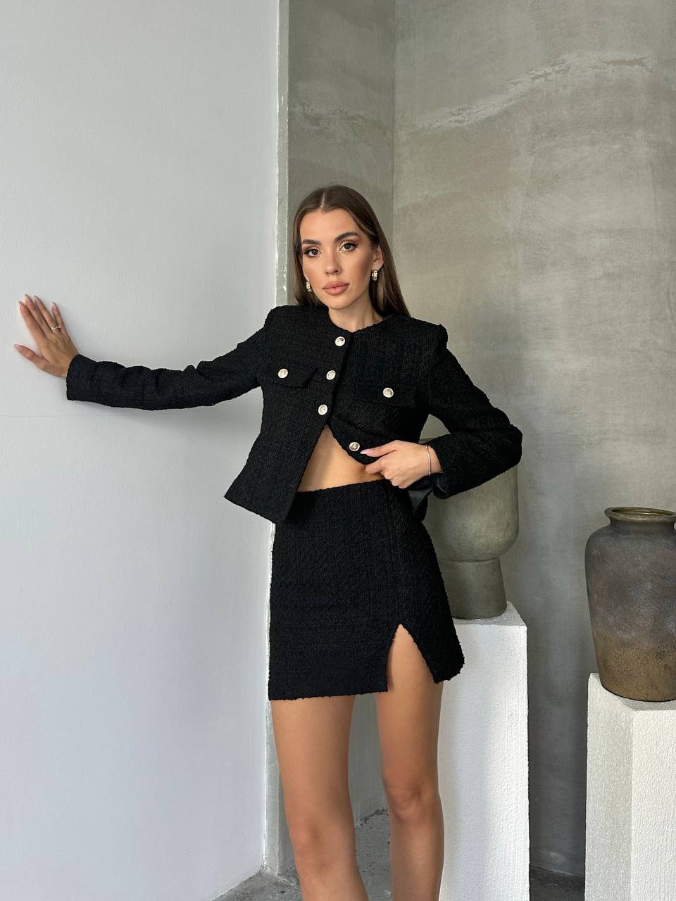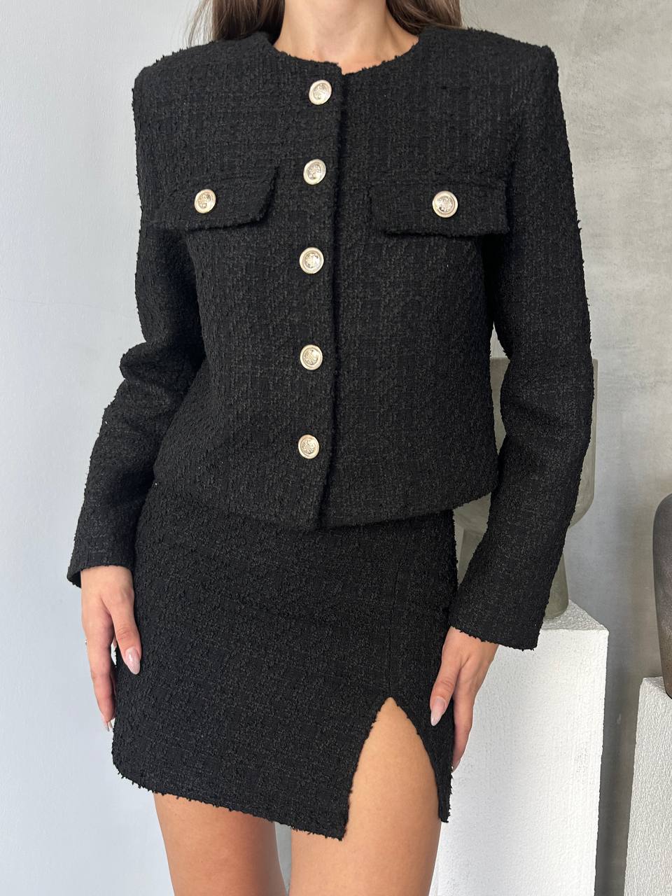 Step into the spotlight with Luxe Halo, where warmth meets sophistication. The jacket, embellished with golden buttons and practical pockets, pairs flawlessly with the elegant skirt, creating a set that exudes luxury and grace. Available in beige and black, this ensemble ensures you shine brightly through every evening affair.