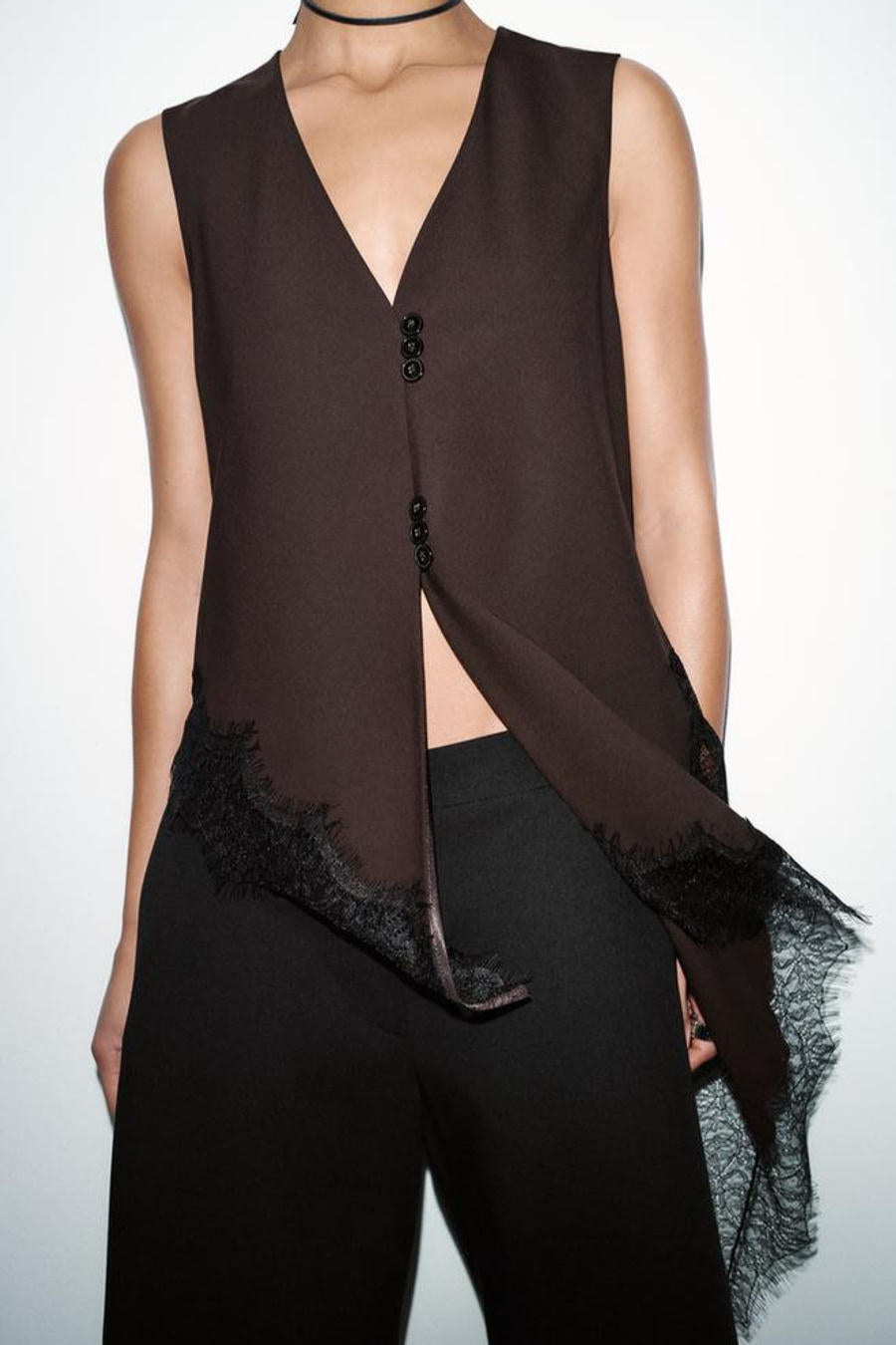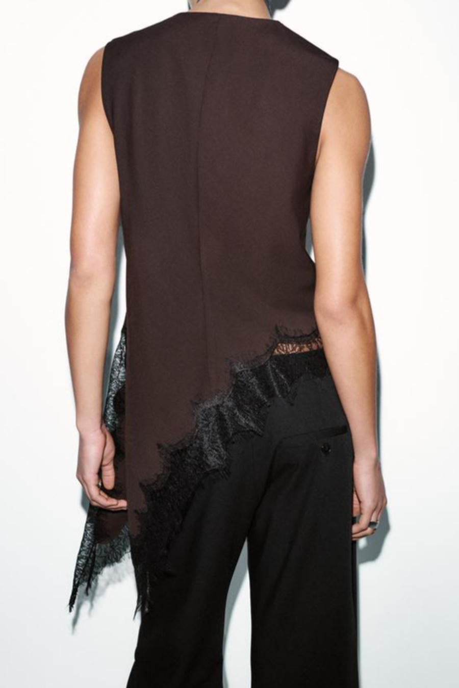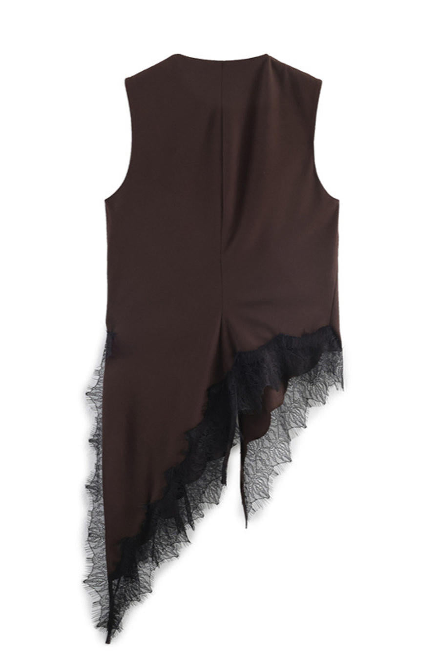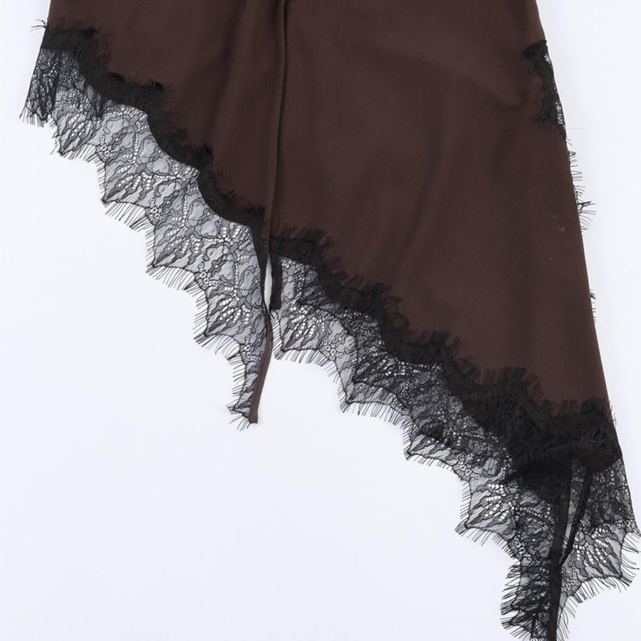 Deep chocolate tones meet delicate lace detailing in a design that feels both romantic and modern. The flowing front panels create movement and softness, adding intrigue to every step. Sophisticated and unexpected, it elevates even the simplest styling.